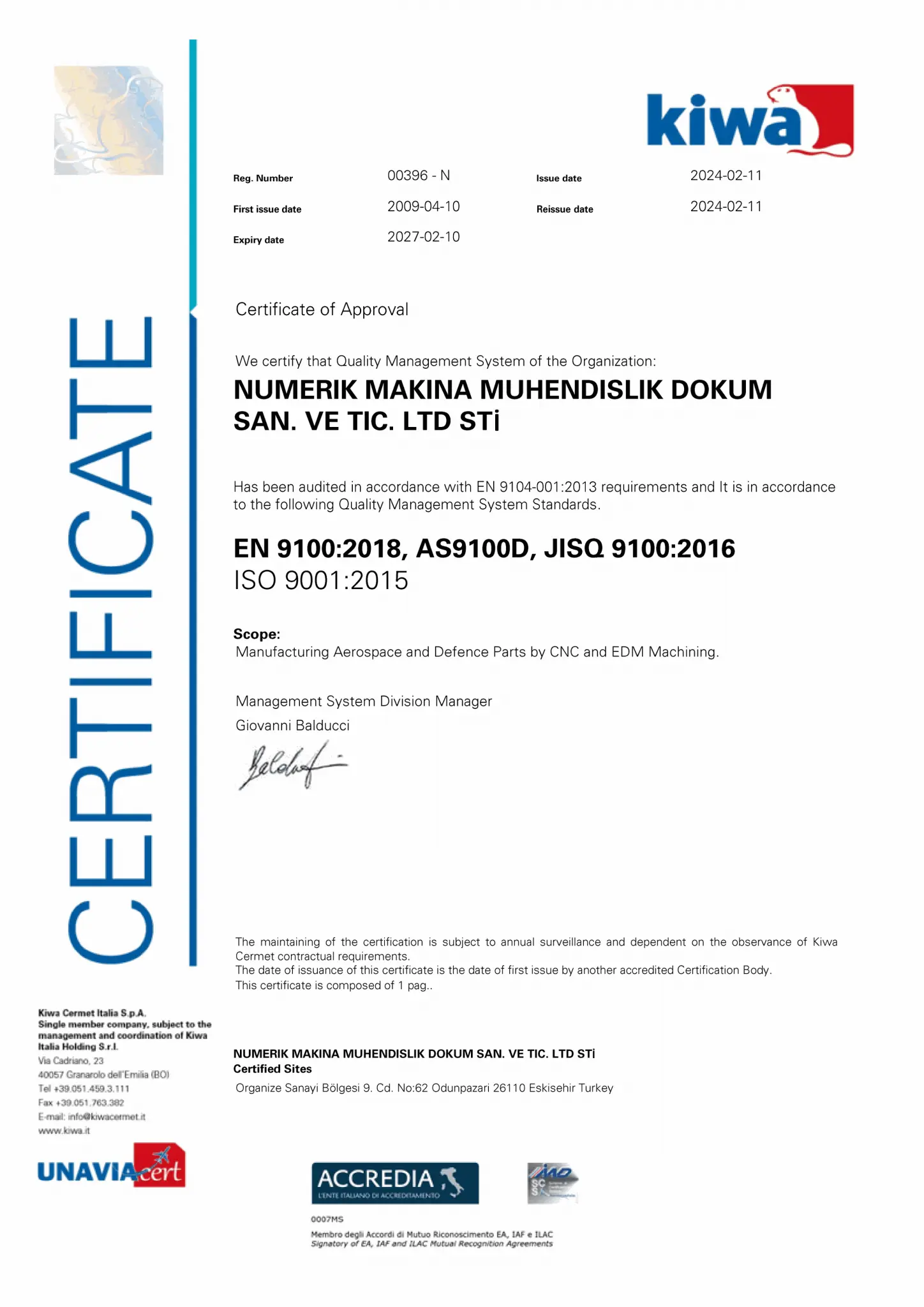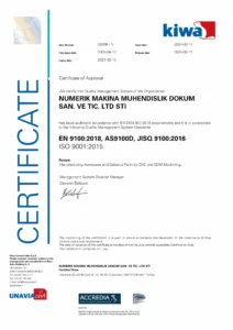 Nümerik Makina’da kalite, sadece bir kontrol aşaması değil; her personelin katılımıyla büyüyen bir kurumsal kültürdür. Hizmet verdiğimiz havacılık sektörünün yüksek disiplinini, insan faktörünü merkeze alan dinamik bir yapıyla birleştiriyoruz. Uluslararası mevzuatlara tam uyum, ulusal standartlarda üretim ve sürekli iyileştirme ilkemizle; her mikronda müşteri odaklı bir mükemmellik vaat ediyoruz. Kuruluş içi açık raporlama ve çalışan memnuniyetini üst seviyede tutarak, kalitenin sürdürülebilirliğini güvence altına alıyoruz.